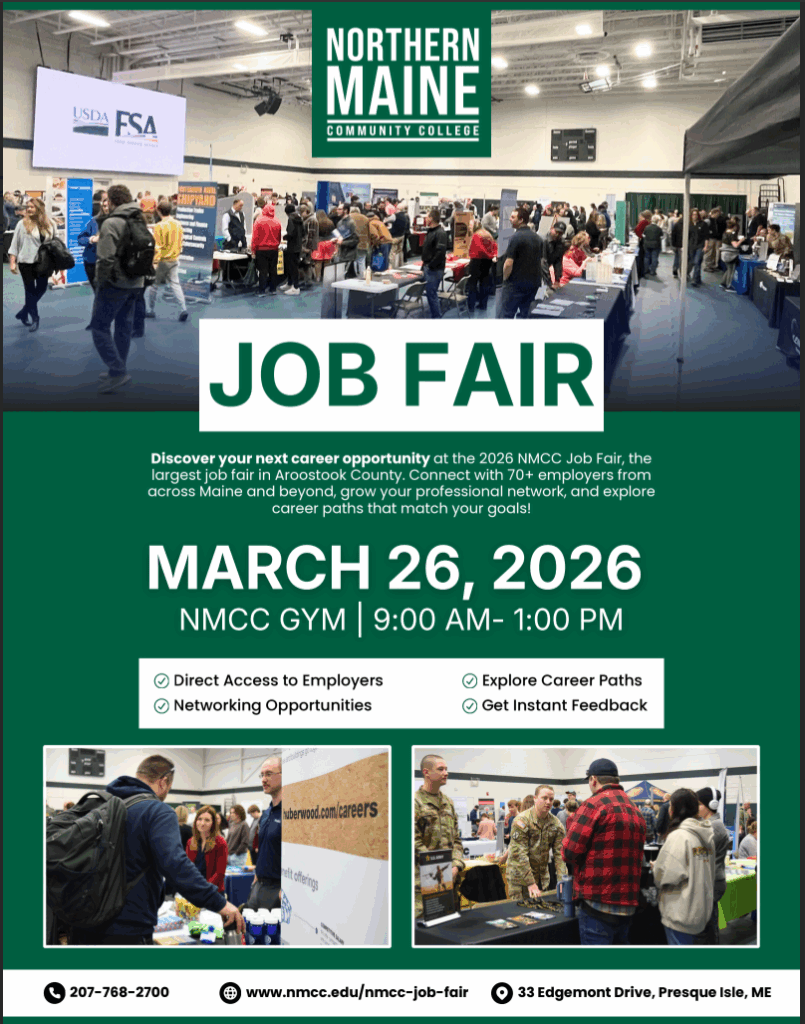 Northern Maine Community College’s Annual Job Fair is the largest job fair in Aroostook County, bringing together employers, students, and community job seekers for a day of networking and career exploration.