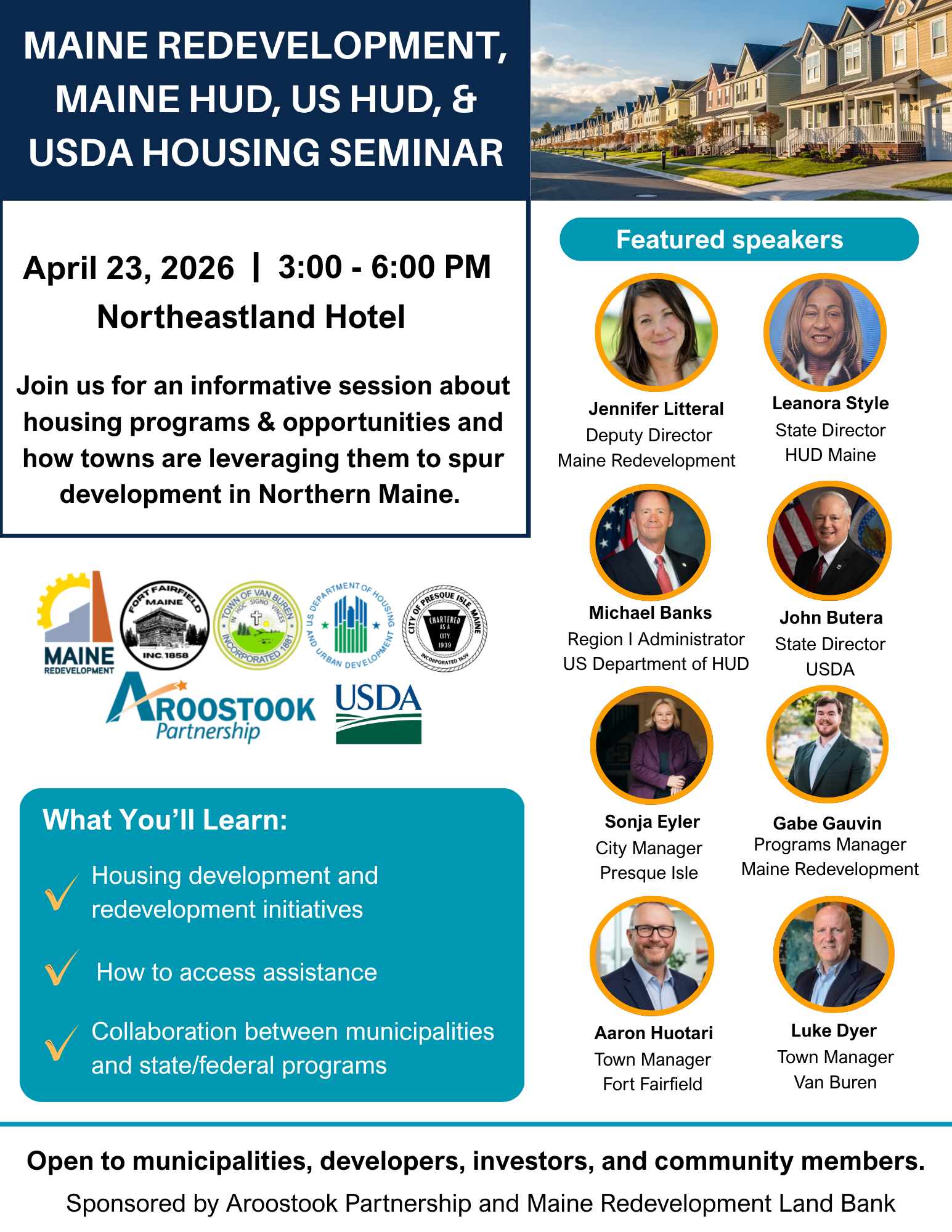 You won’t want to miss this seminar at the Northeastland Hotel on April 23, 2026 from 3:00-6:00pm! Hosted in partnership with Maine Redevelopment, Aroostook Partnership, U.S. Department of Housing and Urban Development, Maine Department of Housing and Urban Development, and USDA Rural Development, this event will highlight how towns can leverage state and federal housing programs to drive growth.